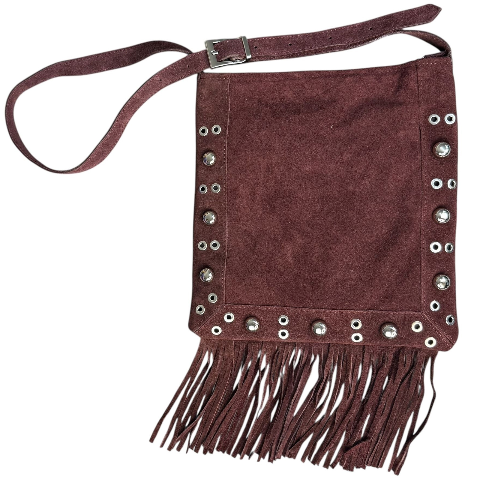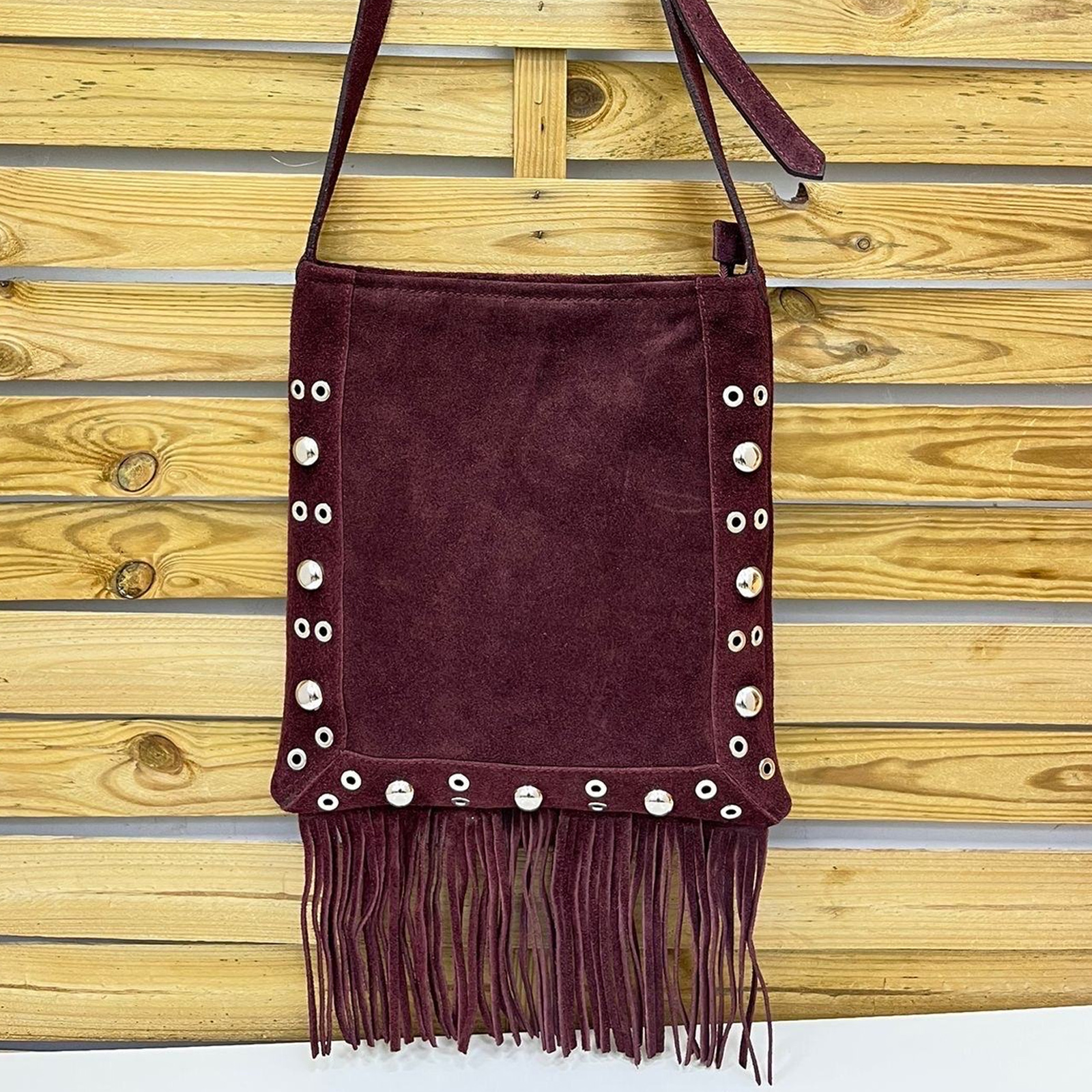 Bolso Bandolera de Ante con Flecos y Tachuelas – Color Burdeos – (Mod. 1395)